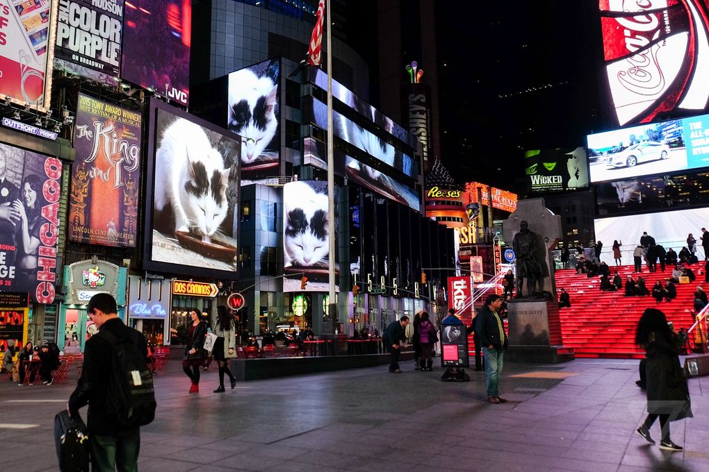 Per tre lunghi minuti, in una sera qualsiasi, il video di un gatto che tutto tranquillo beve il suo latte è apparso su 15 maxi schermi di Times Square all’unisono. Nonostante la maggior parte della gente, nella frenesia di luci e colori della piazza, non si fermi quasi mai a guardare, trovare video insoliti sui tabelloni di New York non è un evento così strano. Esiste infatti un programma chiamato “Midnight Moment” che porta ogni mese un video diverso preso dal web, di natura generica come appunto quello del gatto, sugli schermi giganteschi della Grande Mela.