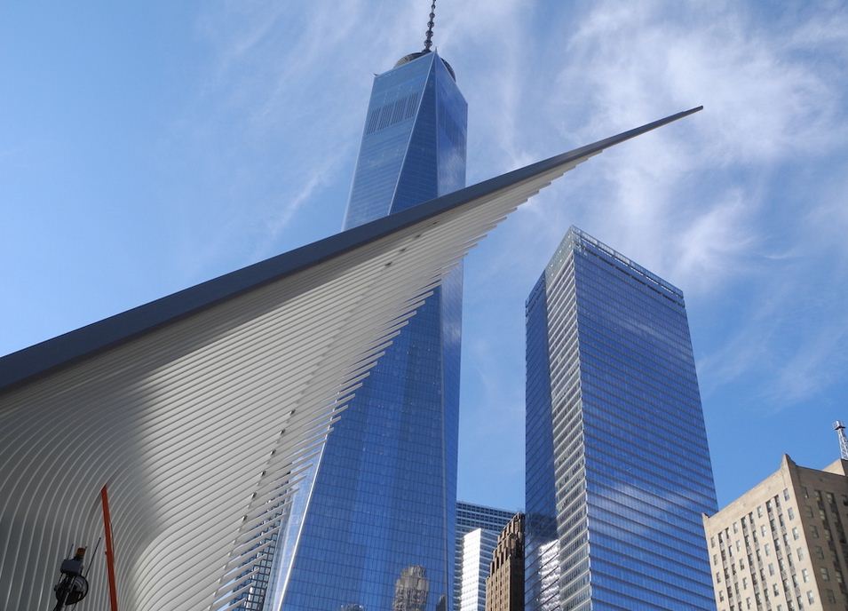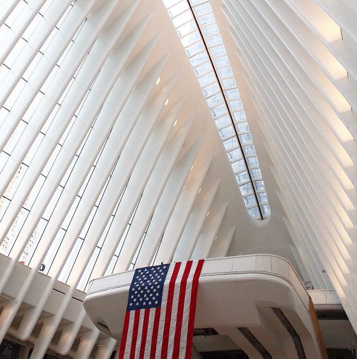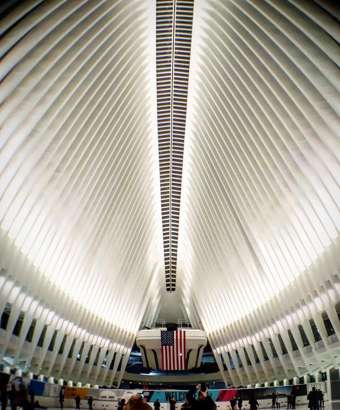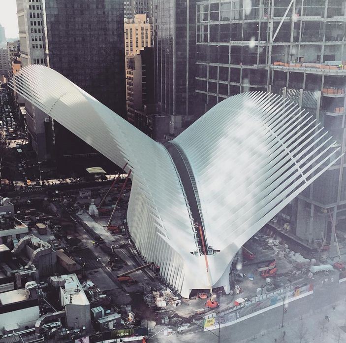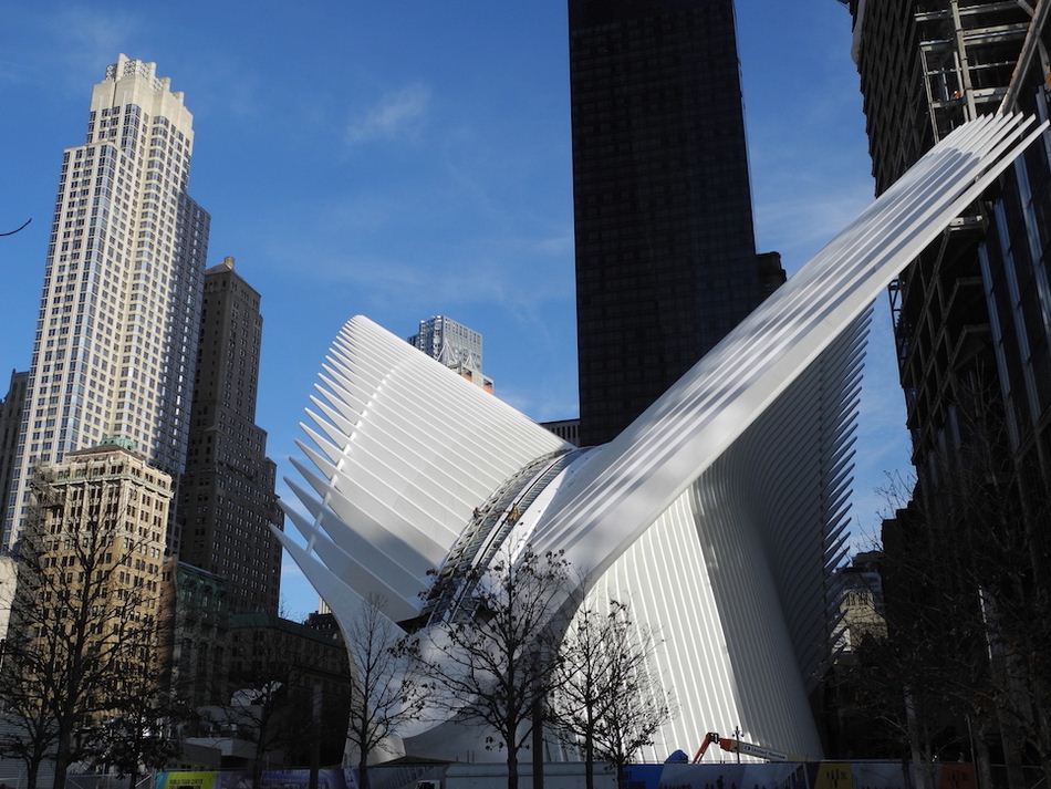 Il World Trade Center Transportation Hub è stato costruito dove si trovava una volta un centro commerciale distrutto dagli attentati dell’11 settembre 2001: si compone di una struttura con due grandi ali di acciaio alta circa 50 metri da terra e con una parte interrata.