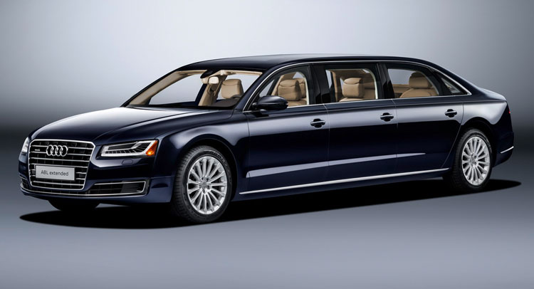 Questi ultimi sono rivestiti in pelle Valcona di colore beige, mentre la sola colorazione per la carrozzeria esterna disponibile al momento è blu metallizzato. I sedili presenti in seconda e terza fila sono singoli e autonomi, gestiti da un sistema elettrico di regolazione. In terza fila sono anche presenti un box frigorifero, una consolle centrale, un display Rear Seat Entertainment. Per l’Audi A8 L Extended è stato scelto un motore V6 TFSI 3.0, in grado di sprigionare 310 cavalli di potenza e 440 Nm di coppia. I 100 km/h si raggiungono, partendo da 0, in 7,1 secondi, mentre la velocità massima dichiarata è di 250 km/h. L’impianto frenante, nascosto da cerchi da 19 pollici a 15 razze, è identico agli altri modelli della serie A8, dunque parliamo di una qualità altissima.