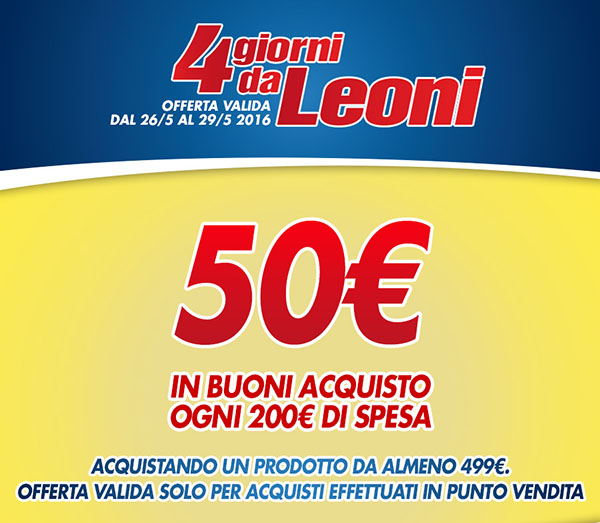 Da Euronics tornano i “4 Giorni da Leoni”, quattro giorni in cui approfittare di 50 euro di buoni acquisto ogni 200 euro di spesa, acquistando un prodotto di almeno 499 euro. L’offerta è valida da oggi 26 maggio fino al 29 maggio 2016, mentre i buoni sono poi spendibili dal 1 al 30 giugno 2016, unicamente nel punto vendita in cui sono stati emessi, in soluzione unica e senza possibilità di avere resto. Dalla promozione sono esclusi servizi di qualsiasi genere, buoni sconto, buoni spesa ricevuti in relazione ad altre promozioni, ricariche telefoniche, carte regalo e servizi integrativi. Inoltre l’iniziativa non è cumulabile con altre promozioni in corso. Per scoprire il negozio aderente più vicino a voi vi rimandiamo sul sito ufficiale Euronics.