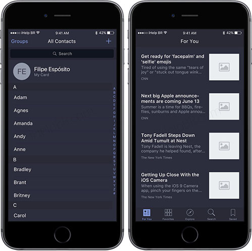 Sin dalla sua prima versione iOS, il sistema operativo dei dispositivi mobili Apple, è sempre stato rigorosamente chiaro, per quanto riguarda i menu e le barre. Anche Mac OS X fondamentalmente ha sempre avuto barre e dock chiari, dal debutto di Yosemite però è stato introdotto anche un tema scuro, per gli amanti del nero. Cosa accadrebbe se Apple portasse un tema simile anche sugli iPhone e sugli iPad? Il magazine brasiliano iHelpBR ha provato a immaginarlo, creando delle immagini davvero di ottima qualità. A voi piacerebbe?