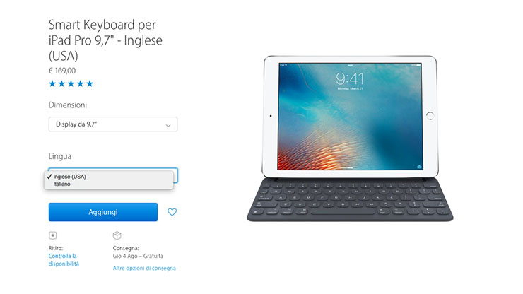 Oggi finalmente la società di Cupertino ha colmato questa lacuna rendendo disponibili sul suo Store ufficiale le Smart Keyboard con i layout internazionali, fra cui ovviamente anche quello italiano. Le nuove tastiere si possono acquistare a questa pagina, anche se il prezzo non è proprio adatto a tutte le tasche: ci vogliono 179 euro per la versione da 12,9 pollici, 169 per l’iPad Pro più piccolo da 9,7.
