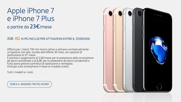 - iPhone 7 Plus 32 GB: anticipo 149€ + 55€ ogni 4 settimane per 32 mesi