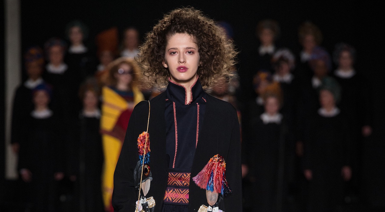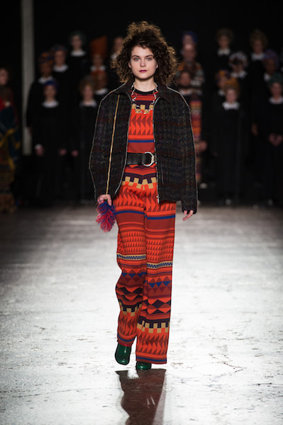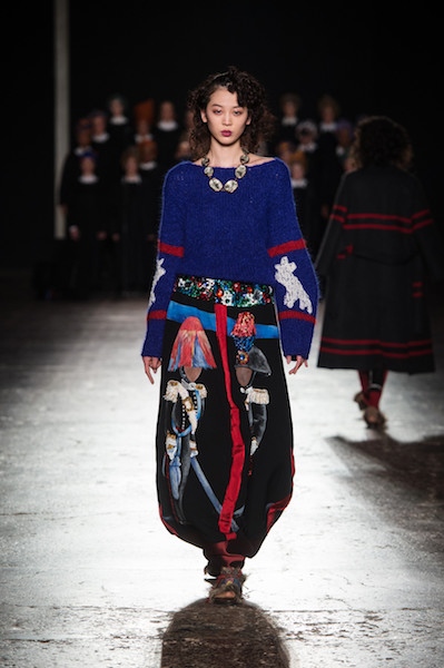 Ecco che cappotti e giacche dall’impronta classica, sono arricchite da stampe e ricami; trench in cotone spalmato; Montgomery in panno e Loden in tessuto originale; camicie in cotone e seta con dettagli in pizzo – passamanerie – abiti con pettorine e colli ricamati con maschere africane o ritratti di famiglia; abiti mini, midi e maxi, rigidi e fluidi; gonne con sovrapposizione di pannelli e tasche, ricamati e non; pantaloni con bande laterali ispirati alla classica divisa da carabiniere.