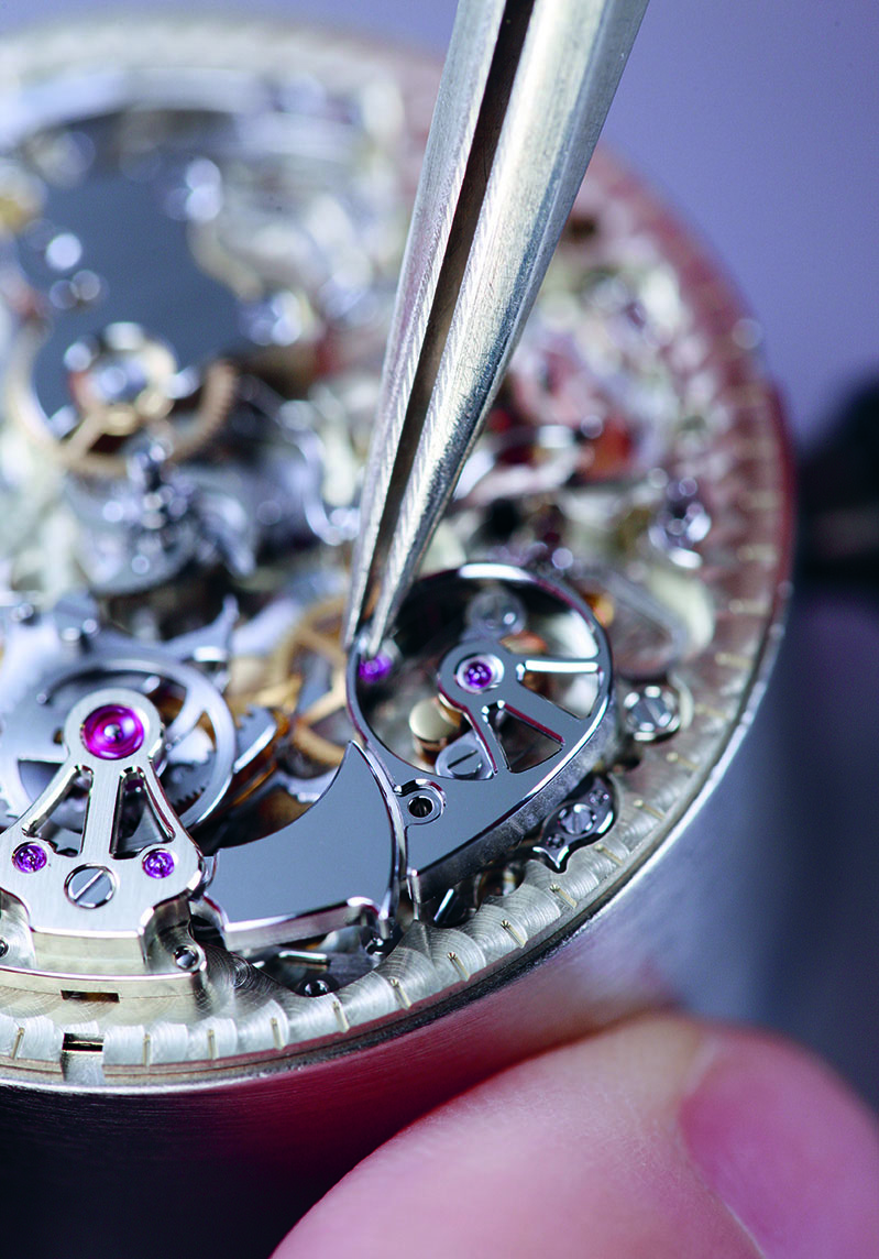 Tutti i componenti del calibro 08.01-L sono accuratamente finiti o a perlage o a Côte de Genève o con la tecnica del “trait tiré”. In ogni caso, si procede a un’operazione accurata di anglage interamente realizzata a mano. La platina e i ponti sono in alpacca, un metallo nobile che non perdona alcun errore di esecuzione, neanche la minima scalfittura. Non essendo trattata, l’alpacca è visibile attraverso il fondo cassa con vetro zaffiro del L.U.C Full Strike nel suo colore naturale, grigio leggermente dorato.