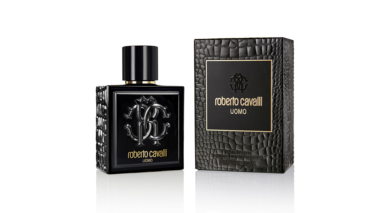 La bottiglia di Roberto Cavalli Uomo è uno straordinario manifesto di stile e intenti, dove l’oro prezioso si fonde con la pelle nera di coccodrillo.