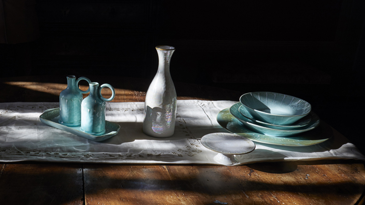 Ne è un esempio la collezione Etereo, una linea nata nel 2016 ispirata alla leggerezza e all’eleganza, come dice il nome stesso. Per superare la freddezza che talvolta caratterizza proprio gli oggetti più eleganti, la scelta è stata quella di “far parlare” luce e colore. Da qui la scelta del turchese, estremamente luminoso, irradiante, associato a forme irregolari che spezzano, variano i confini delle forme stesse, associato al bianco di alcuni elementi. Lo stesso trattamento del colore, con diversi reagenti, è volutamente irregolare, tanto da ottenere elementi con toni mutevoli e oscillanti.