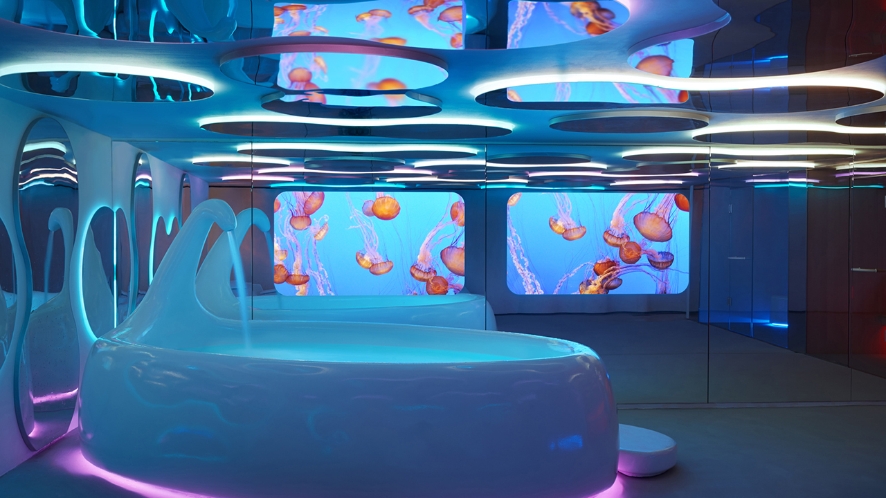 Dai profondi e vitali fondali marini alla bellezza pura e fresca dei paesaggi terrestri, ogni frangente dello spazio muta aspetto e caratteristiche. E’ il costante fluire dell’acqua, con il suo intrinseco potere purificatore e catartico, a dare forma all’ambiente: modella la soffice delicatezza delle vasche e degli arredi, rende candide forme, essenziali il calore della sauna ed inebriante vapore del bagno turco. L’acqua si riflette nelle supercifi specchiate e si moltiplica nelle immagini degli schermi, intensificando le sue qualità depuranti ed il suo essere rigeneratrice.