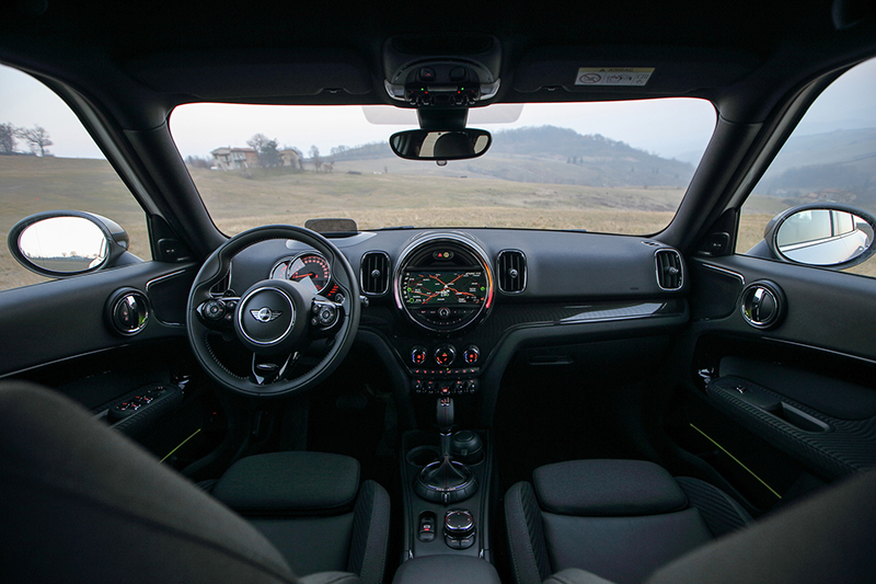 All’interno una plancia del tutto nuova pur sempre dal sapore decisamente Mini. Il grande elemento centrale ospita l’infotainment, optional lo schermo da 6,5 o 8,8 pollici, ciascuno accompagnato dal navigatore satellitare e un comando touch sul tunnel (per la versione da 8,8″). Chicche hi-tech sono rappresentate dal Mini Country Timer, che consente di tenere nota del tempo trascorso su ciascun tipo di percorso: dalle strade asfaltate agli sterrati, fino ai passaggi innevati. I dati arrivano dall’unità di controllo del DSC.