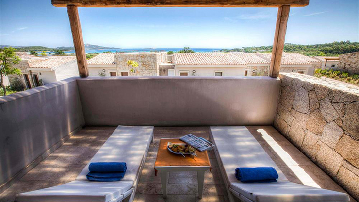 Le terrazze e le torrette private, offrono ambienti di relax nella privacy della propria camera con vista magnifica sul parco, la laguna e la baia, con l’isola di Tavolara sullo sfondo.