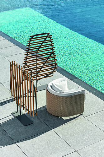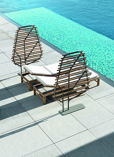 Progettata da Emmanuel Gallina, Clostra nasce dall’incontro tra due materiali: teak e alluminio. La sua forma, ispirata alle trame e alle venature delle foglie, è una danza armoniosa che alterna metallo e legno. Le doghe di teak naturale giocano su due livelli, suscitando un senso di profondità e trasparenza.