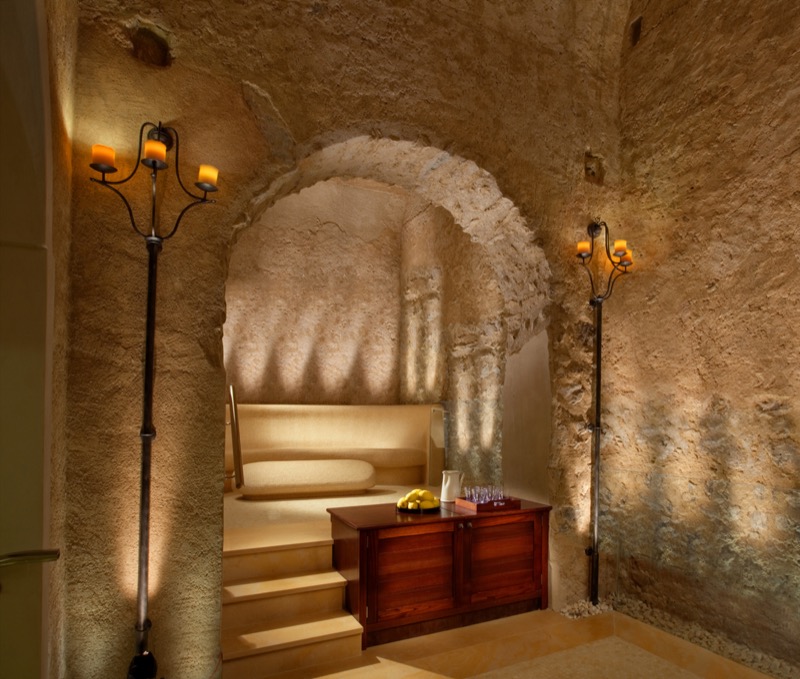 Inaugurato cinque anni fa, dopo ben dieci anni di restauri curati con passione dalla proprietaria americana Bianca Sharma, questa primavera il Resort ha rinnovato nel segno della naturalità la piscina a sfioro. Modellata a mano, a sbalzo sul mare, si fonde col paesaggio ed ha particolarità uniche al mondo: il suo fondo ondulato, che si adatta alla roccia su cui poggia, brilla di quarzi dai mille riflessi e regala la sensazione di immergersi in un magico fondale marino, con effetti morbidi e vellutati sulla pelle. Un effetto reso ancora più suggestivo da un’illuminazione studiata con cura e da alcuni monoliti che rendono più realistico il fondale. Di totale relax la carezza dolce delle microscopiche bollicine dell’idromassaggio. Impareggiabile il panorama che sia apre sul golfo di Salerno, con le linee dell’orizzonte vicino e lontano che sembrano fondersi.
