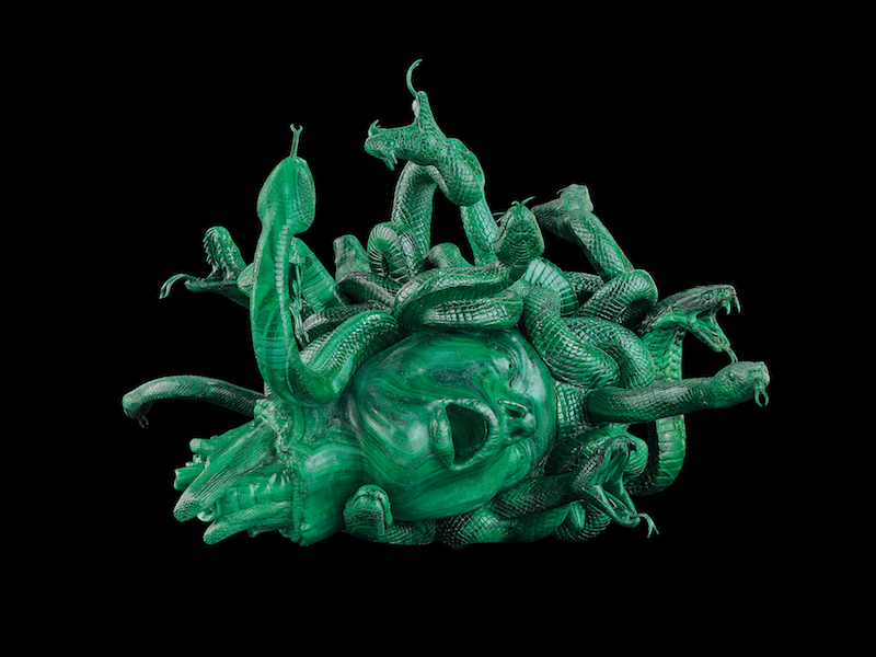 Una vastità di temi che si riscontra anche nella pluralità dei materiali usati. Sculture in bronzo e marmo di Carrara si alternano a teste di Medusa in giada e cristallo. Installazioni monumentali ricoperte di finti coralli, così perfetti da sembrare veri, sono accostate a opere in oro e resina.