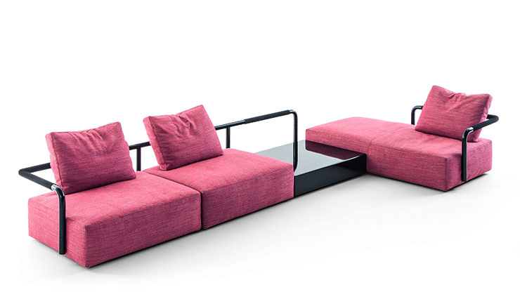 Grcic sviluppa questo forte elemento architettonico utilizzando il tubo a vista che delimita il perimetro del divano, creando un confine protettivo che definisce lo spazio all’interno dello spazio. Il tubo è costituito da quattro diverse parti intercambiabili, unite grazie ad un sistema di giunti invisibili, che permettono la realizzazione di diverse composizioni. Alcuni segmenti esterni del tubo sono ricoperti da poliuretano espanso integrale, sia per motivi estetici che funzionali.
