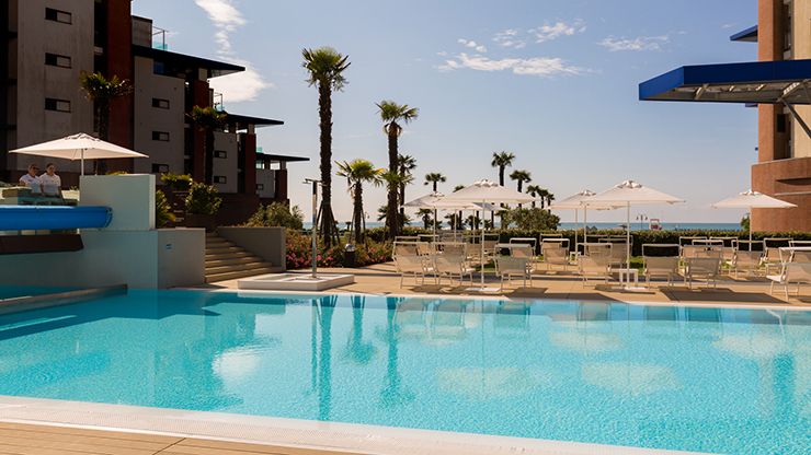 Invariati gli spazi riservati alla piscina, uno dei simboli del Resort, una vera e propria distesa d’acqua lunga 70 metri e riscaldata da 27° a 30°C, parzialmente coperta da una scenografica struttura in vetro che si allunga verso il mare.