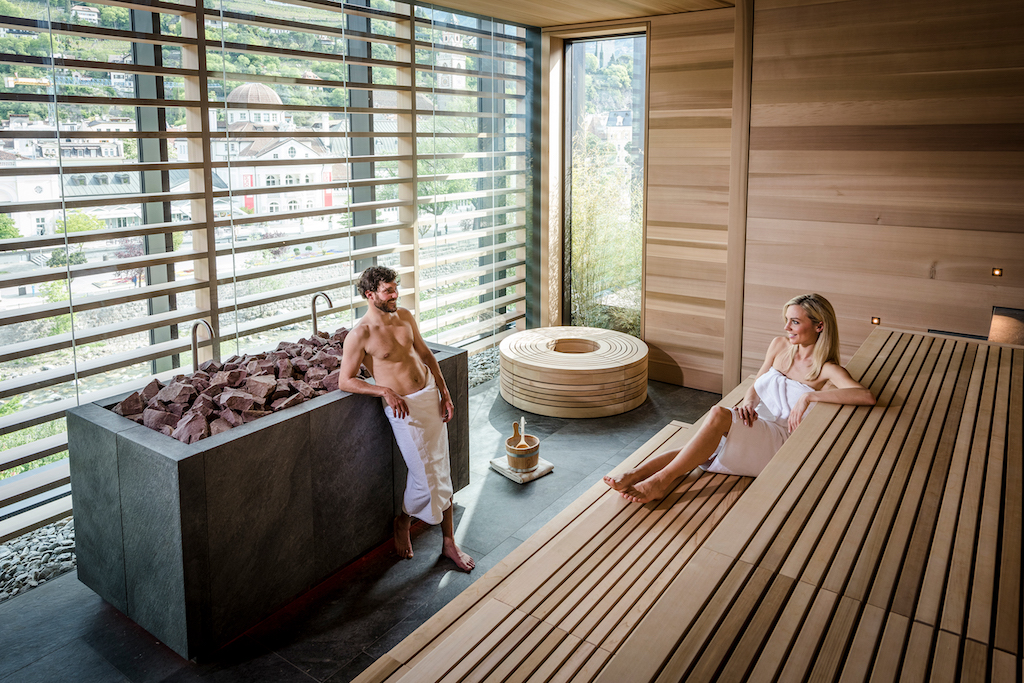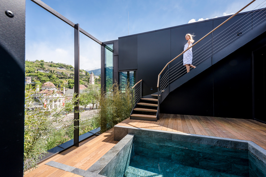 - Un’ampia zona sauna e zona relax con vista spettacolare sul centro storico di Merano, sul Kurhaus e le montagne nei dintorni. Interni di alta qualità con arredamento di materiali pregiati e luci calde. Alcuni dettagli: