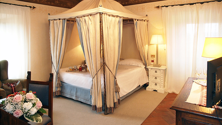 Ambienti di pietra e cotto con pareti affrescate, camini, arazzi, arredamento d’epoca e 12 suite lussuosamente arredate, ognuna diversa dall’altra e dotate di ogni comfort, accolgono gli ospiti in questo mondo d’arte e storia che rende unico questo angolo dell’Umbria, in uno splendido scenario collinare circondato da vigneti.