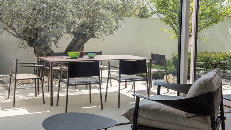 Ne è un esempio la collezione Terramare dello Studio Chiaramonte-Marin, composta da un sistema di divani e poltrone, realizzati in tubolare di alluminio. L’elemento che contraddistingue la collezione è lo snodo in pressofusione di alluminio, evocativo del più istintivo sistema di giunzione dei tronchi di giunco. Braccioli e schienali sono realizzati in eco-cuoio, con una particolare finitura che conferisce a questi elementi un aspetto vissuto.