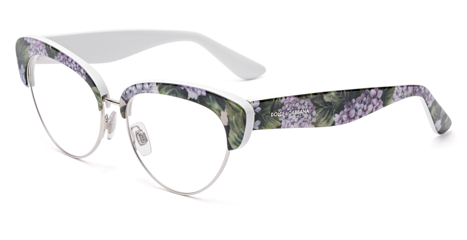 L’ampia montatura rotonda, realizzata in metallo, ha il frontale ornato da volute barocche dorate e da delicati mazzolini di ortensie. Le corolle sono illuminate da un mosaico di piccole perle lilla e oro applicate a mano e coronate da foglie verde pallido. Le grandi lenti rosa sfumate accentuano la raffinatezza del modello e il tema floreale, le aste sono rifinite con motivo barocco. Questo modello (foto in apertura) è presentato in un’elegante bauletto e packaging con stampa Ortensia, ed è disponibile esclusivamente nelle boutique Dolce&Gabbana. La collezione Ortensia si declina in diversi modelli per soddisfare ogni esigenza.