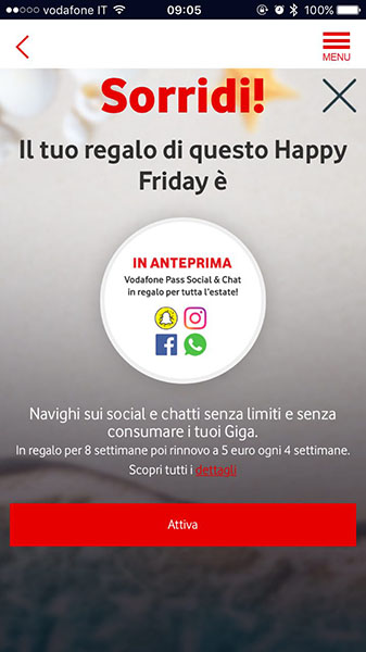 Happy Friday vi regala Vodafone Pass Social & Chat per ben 8 settimane, dopodiché costerà 5 euro ogni 4 settimane, a meno che non la disattiviate prima. La promozione si può attivare soltanto se si ha già un’offerta con GB inclusi, si può inoltre navigare su APN mobile.vodafone.it, iphone.vodafone.it, wap.omnitel.it e su blackberry.net con l’opzione Blackberry. Una buona iniziativa che sicuramente farà la felicità di molti giovanissimi.