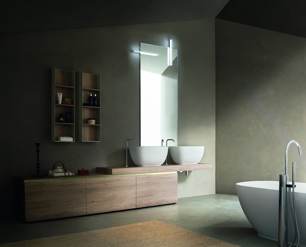 Ne è un esempio l’arredobagno Larice corda, una composizione a doppio lavabo incasso soprapiano. I vassoi in metallo dei vani a giorno sono in accordo cromatico con la finitura lignea e la stessa laccatura è ripresa nella parte esterna degli specchi Moon.