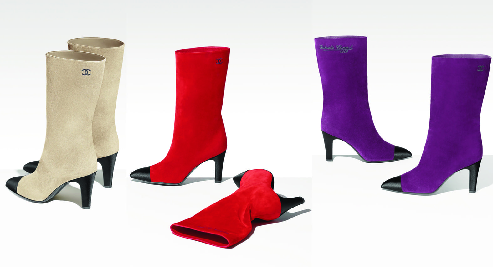 Per la pre-collezione Autunno-Inverno 2017/18, lo stivale CHANEL adotta un look urbano con toni ultra-chic. Elegante e confortevole, si ferma prudentemente a metà polpaccio. A questo punto la firma Gabrielle Chanel, sottotitolata Coco, appare incisa nella pelle. Una sofisticazione sottolineata dai duos colorati: la punta di raso, sempre nera, è accompagnata da pelle scamosciata beige, foglia, bordeaux, mezzanotte o azzurro, melanzana o rosso mattone e grigio. Fa eccezione il modello monocromatico in nero. Ma non manca la versione scintillante…con punta e tacco in vernice nera.