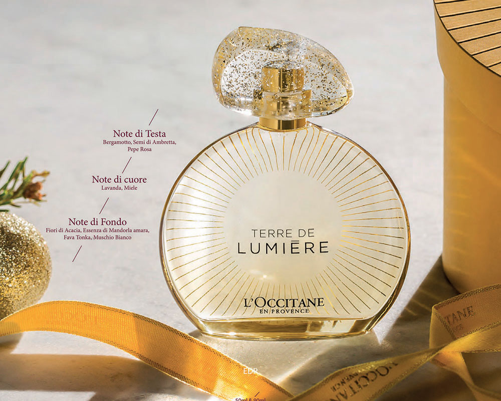 L’Occitane ha catturato l’istante e ha dato incarico di creare una Eau de Parfum a Calice Becker, Shyamala Maisondieu, Nadège Le Garlantezec (tre nasi talentuosi) che hanno respirato l’aria serale della Provenza inondata dalla luce della Golden Hour creando così Terre de Lumiere, ispirato all’oro del sole provenzale, striato di rosso e giallo. Questa alchimia di note dolci e aromatiche è come un cielo vivo nelle tonalità del rosso, giallo e oro. Terre de Lumière EDP è il profumo che si fonde col calore della pelle e batte allo stesso ritmo del cuore, guidato dalla luce del tramonto.
