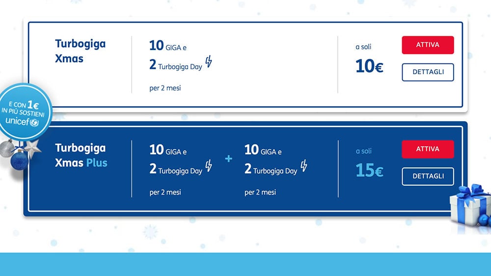 Dopo Vodafone, anche TIM è pronta a lanciare le sue preziose offerte di Natale. Quest’anno l’operatore ha pensato soprattutto a quei clienti bisognosi di GB di internet di mobilità, lanciando la conveniente TurboGiga Xmas. La promo ha un costo una tantum di 10 euro, senza costi di attivazione, e permette di avere 10 GB di internet sotto rete 4G/LTE per due mesi. Un’iniziativa perfetta per chiunque abbia intenzione di partire e di prosciugare il proprio bundle GB inviando foto e video di auguri. Inoltre i vantaggi non finiscono qui: con appena 5 euro in più si può raddoppiare TurboGiga Xmas, aggiungendo ulteriori GB al proprio bundle o a quello di una persona cara.