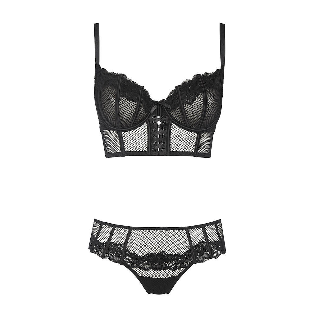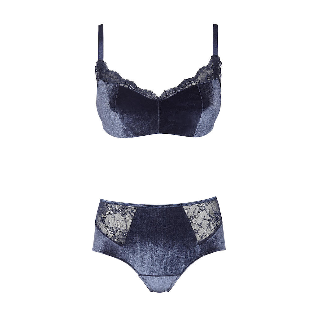 Balconcino e body in velluto in una elegantissima tonalità di avio, reggiseno in pizzo e tulle cipria la cui sovrapposizione crea un seducente effetto nude look, un bustier ad altissimo tasso di seduzione e una bralette per non rinunciare ad uno dei must have della stagione.