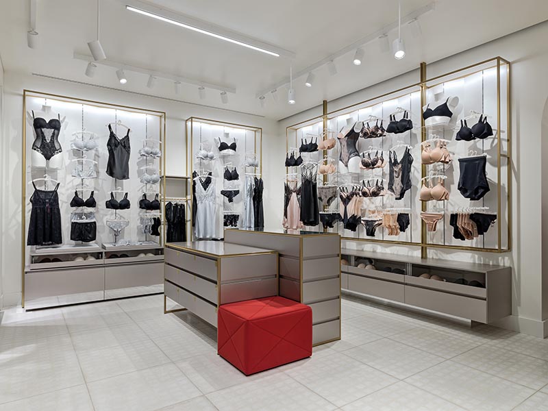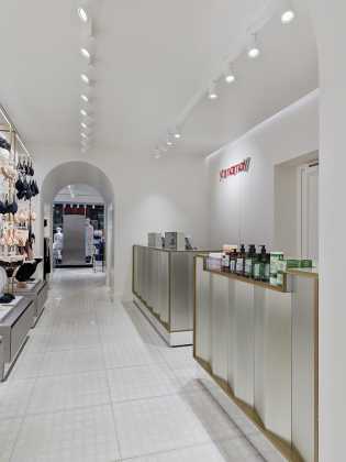 Utilizzato come simbolo ripetuto sulla carta da parati e sugli specchi o, ancora, sui paraventi metallici traforati al laser, il nuovo grafismo definisce lo sfondo dei prodotti esposti ed evidenzia, grazie alla sua qualità astratta, gli assiomi relativi a leggerezza, geometria e simmetria. Vi si innestano gli espositori a parete: appenderie composte da un’esile cornice in finitura oro spazzolato, arricchite da pannelli inclinati di colore avorio che generano un sofisticato motivo a zig-zag, quasi a ricordare l’impalpabile e aggraziato movimento della farfalla. Sotto di esse, sono invece posizionate cassettiere orizzontali della medesima larghezza, con finitura in legno laccato grigio chiaro e zoccolo in acciaio lucido, utili per riporre le merce e renderla facilmente accessibile al personale. Gli arredi freestanding, al centro dello spazio vendita, sono infine dotati delle medesime caratteristiche, con struttura metallica e cassetti estraibili in legno per la massima funzionalità. Hanno top in vetro che costituisce, di volta, in volta, un comodo ripiano su cui mostrare gli articoli scelti dal cliente o collocare piccole grucce con i capi più emblematici delle collezioni.