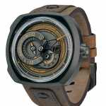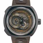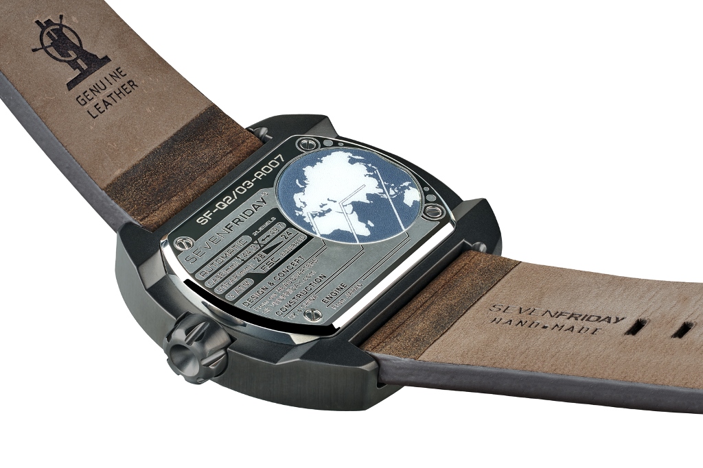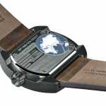 La cassa in PVD color carbone riprende le tonalità di una carrozza della locomotiva a vapore nell’interfaccia decentrata multi livello. I manometri usati per misurare la pressione sono sfumati di nero, grigio e rame a ricordo della principale fonte di calore per produrre il vapore. Il cinturino in pelle cerata “crazy horse”, ispirato ai guanti vissuti dei ferrovieri.