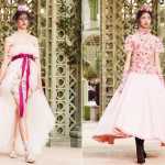 Glicine ricamate, mazzi di camelie, viole del pensiero, anemoni, ranuncoli e garofani sbocciano dappertutto, mentre i papaveri sono stampati sul tulle di un vestito arruffato e grandi fiori in colori acquerellati sono dipinti su una gonna lunga che è leggera e fluida.