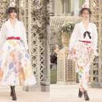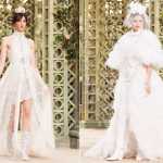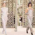 Le linee si sovrappongono, combinando finezza e volume, in una cascata di ricami floreali, pieghe e balze eteree. Miniabili senza spalline impreziositi interamente da paillettes sono velati da un tulle ricamato con delicati fiorellini plumetis; altri sono dotati di un plastron dal collo alto cucito con una treccia ingioiellata, o come un lungo tubino rivestito di tulle di seta merletto nobilitato con cocci di silicio argento. Un abito a gabbia impreziosito e gonfio di piume arricciate passa su un abito lungo in raso duchesse la cui purezza è interrotta solo da una gonna che ricopre il tulle.