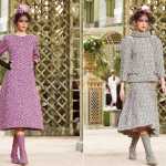 Le piume le accarezzano le spalle o le caviglie, estendendo il tweed intrecciato e il raso opaco. All’interno di questa morbidezza, la sua femminilità si esprime attraverso una gamma di toni delicati: rosa tenero, corallo, limone glassato, menta e grigio. Ma anche colori più intensi tra cui nero, argento scintillante, inchiostro, verde clorofilla fucsia e blu elettrico. Sotto i primi raggi di sole, l’iconico abito di tweed diventa rosa pallido o bianco. La giacca a taglio dritto o leggermente a trapezio è definita da un colletto rilassato, una manica kimono rivisitata, una spalla arrotondata e un dorso leggermente bombato.