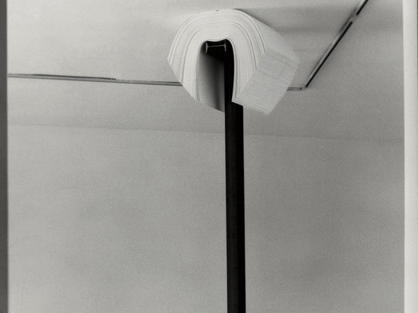 Senza titolo si presenta come una lunga putrella di ferro, montata in verticale, che occupa in altezza tutto lo spazio, dal pavimento al soffitto. Sulla sua sommità è adagiata una grande risma di fogli da disegno, che piegandosi naturalmente verso il basso formano una sorta di capitello.