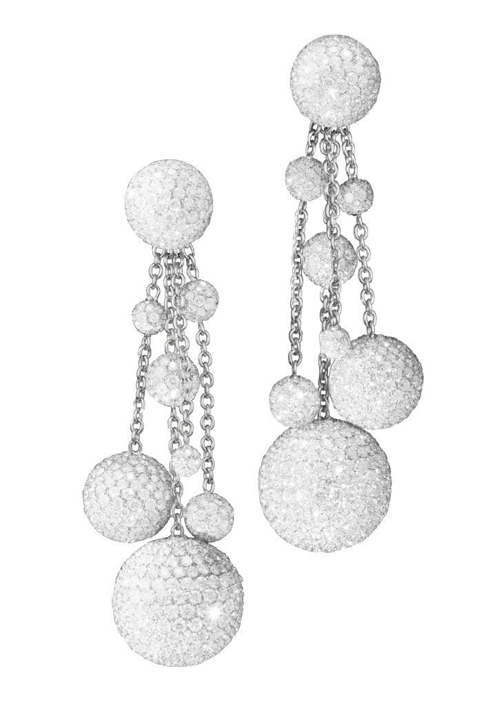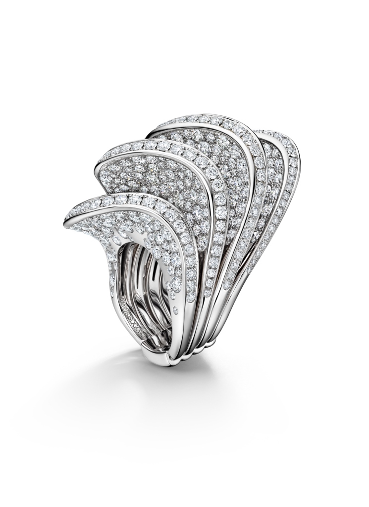 Rita Ora ha indossato gli iconici orecchini Boule in oro bianco con 1.448 diamanti bianchi taglio brillante, abbinati all’anello Onde in oro bianco con 666 diamanti bianchi e all’anello Vortice in oro bianco con 47 diamanti bianchi.