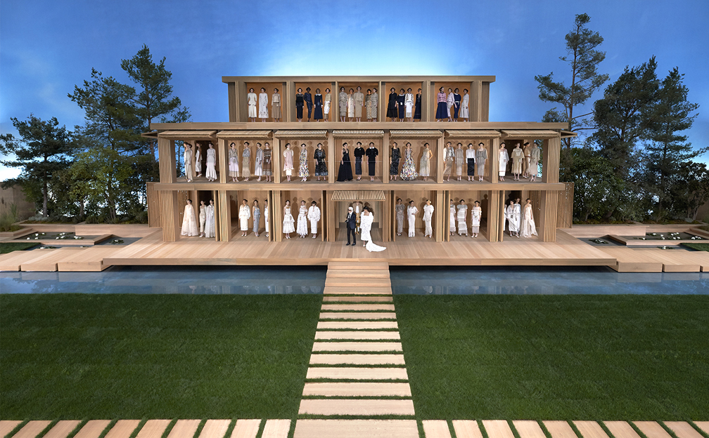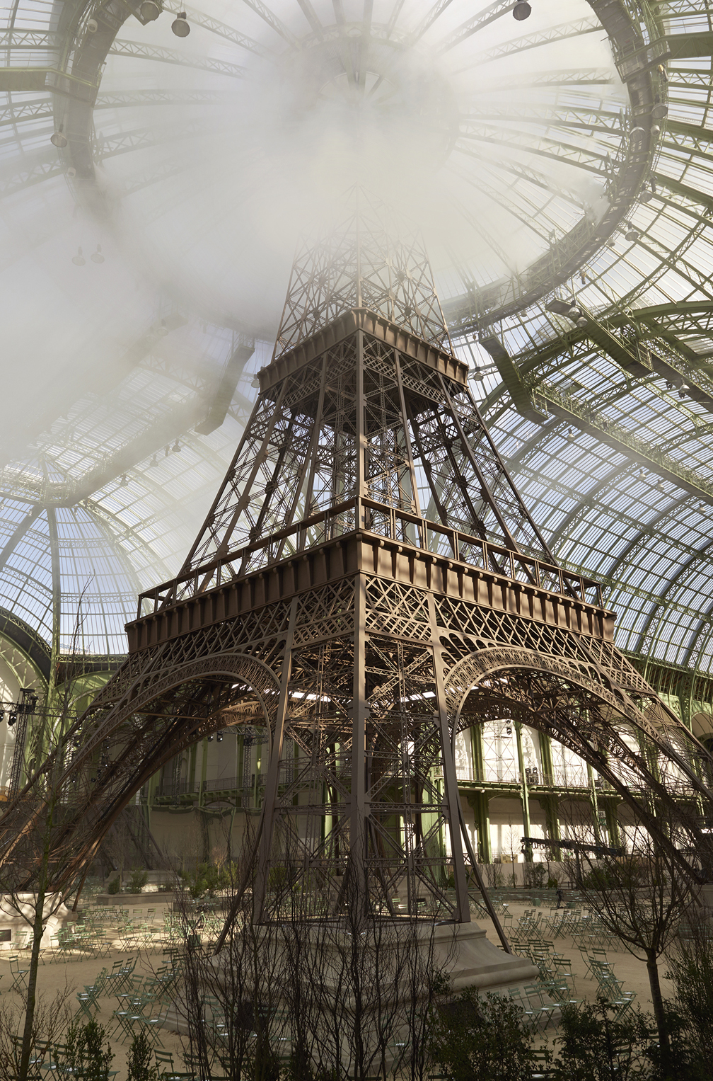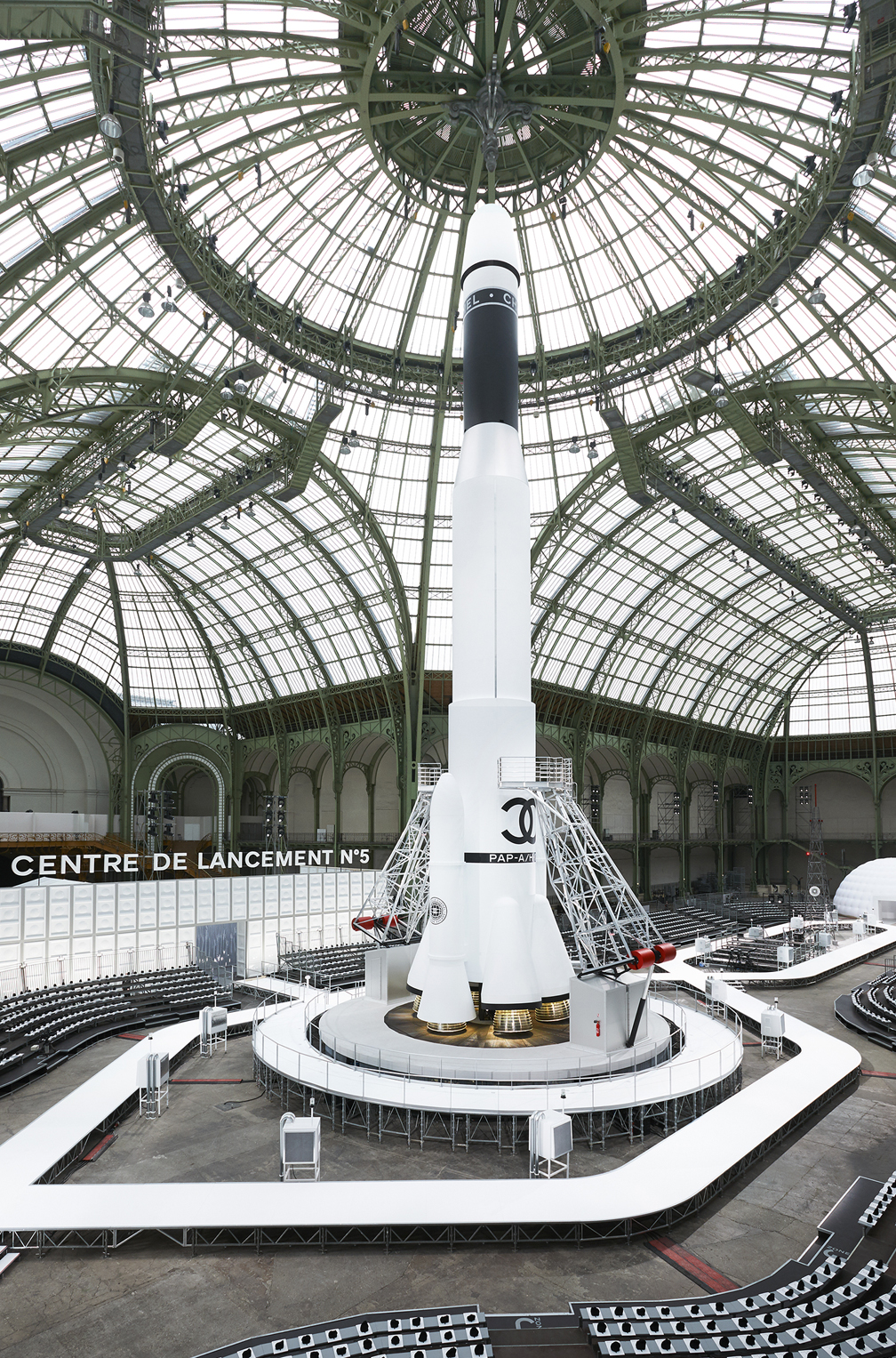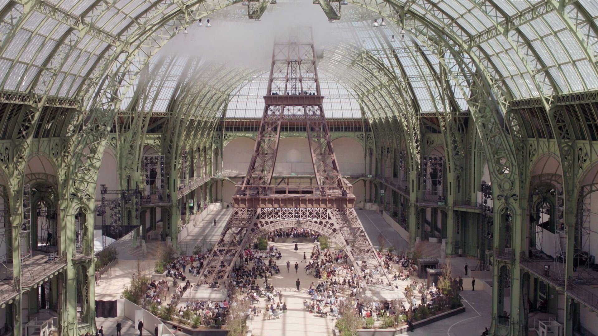 La Nave ha accolto sculture monumentali della giacca e del leone di Chanel che tanto amava Gabrielle Chanel, così come un gigantesco mappamondo, sculture di ghiaccio sotto forma di un iceberg, turbine eoliche, cascate, una casa in legno e, in un sorprendente omaggio a Parigi, un modello della Torre Eiffel. L’audacia creativa sconfinata di Karl Lagerfeld ha visto anche questo luogo simbolico trasformarsi in un classico anfiteatro greco nel cuore di una vera foresta, un teatro devastato, un centro commerciale, una scena di strada parigina per una marcia femminile, un aeroporto, una brasserie parigina, un giardino alla francese e un boschetto ispirato a Versailles, e persino un trampolino di lancio per una nave spaziale che si sollevava sotto il tetto di vetro a cupola. Ogni impresa è nata dall’inesauribile fantasia del designer.