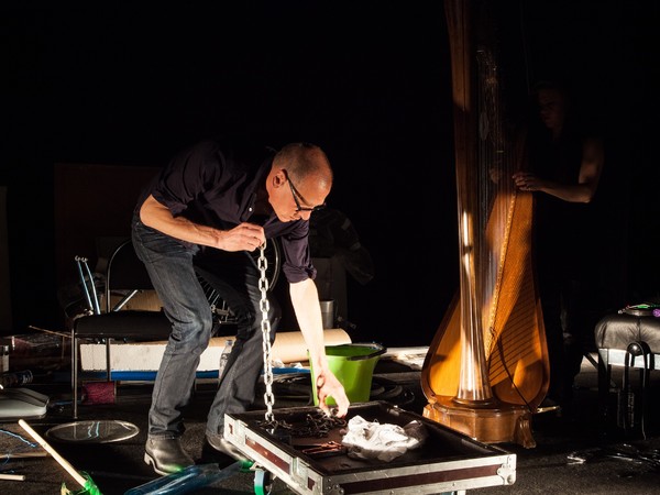 Insieme a lui performano Okkyung Lee, violoncellista sudcoreana, e Luc Müller, percussionista svizzero, dando vita a una composizione senza regole prestabilite, in cui lo spazio stesso viene attivato dai performer mentre stimoli acustici e visivi si intrecciano tra loro. A differenza della musica concreta dove i suoni sono registrati e distorti durante la riproduzione – attraverso il rallentamento, l’accelerazione o l’amplificazione – Marclay crede nel naturale potenziale acustico di qualsiasi oggetto, che quindi non richiede di essere amplificato. Musicista senza strumenti, esegue un concerto in cui ogni rumore è musica.