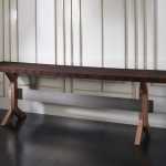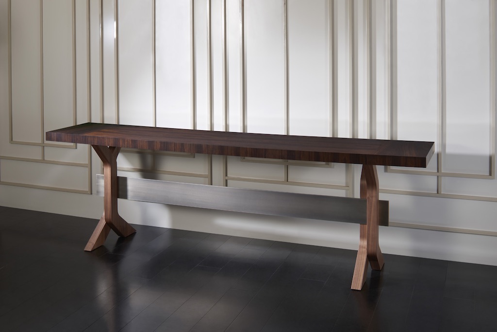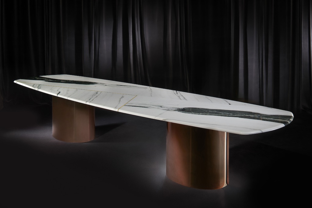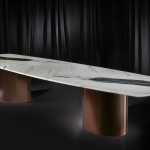 Un gioco di contrasti imprevisti sottolineato anche dall’uso del metallo, abbinato con sapienza a legni pregiati come il palissandro e il noce canaletto nella consolle Beaune. Ma è nell’omonimo tavolo che il metallo bronzeo diventa un codice distintivo, utilizzato nel basamento come elemento strutturale e per scandire la superfice monolitica del top, realizzata in raro marmo panda white dalle tonalità bianche con magnifiche sfumature nere.