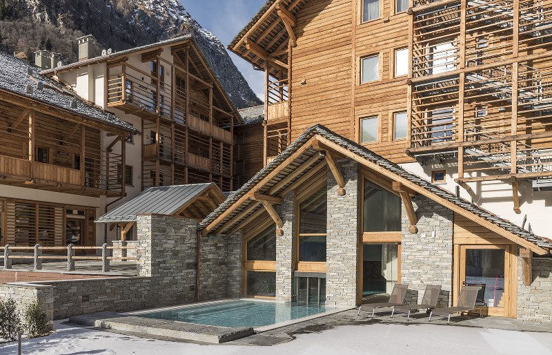 Si tratta di una struttura architettonica unica, accogliente e modera, in cui tradizione e avanguardia tecnologica si fondono e dove l’atmosfera classica della baita di montagna si mixa all’esclusività e al comfort di lusso. E’ realizzata con materiali tradizionali, come pietra e legno, nello stile che richiama le tipiche baite Walser ma offre tutti i comfort di un alloggio moderno. Formata da tre edifici, collegati fra loro da portici e balconate, la struttura è certificata con Classe A e garantisce quindi una vacanza sostenibile e all’insegna del risparmio energetico, in totale simbiosi con la natura circostante.