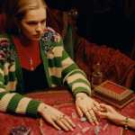 Nella nuova campagna Gucci, Tippi Hedren interpreta la misteriosa veggente. Seduta in un interno sontuosamente arredato di una Los Angeles contemporanea, con sedie dorate, tovaglie di seta, cristalli e candele, attira l’attenzione dei suoi giovani visitatori mentre pratica l’arte della chiromanzia e guarda attraverso la sfera di cristallo.