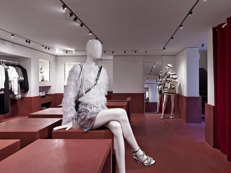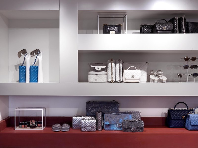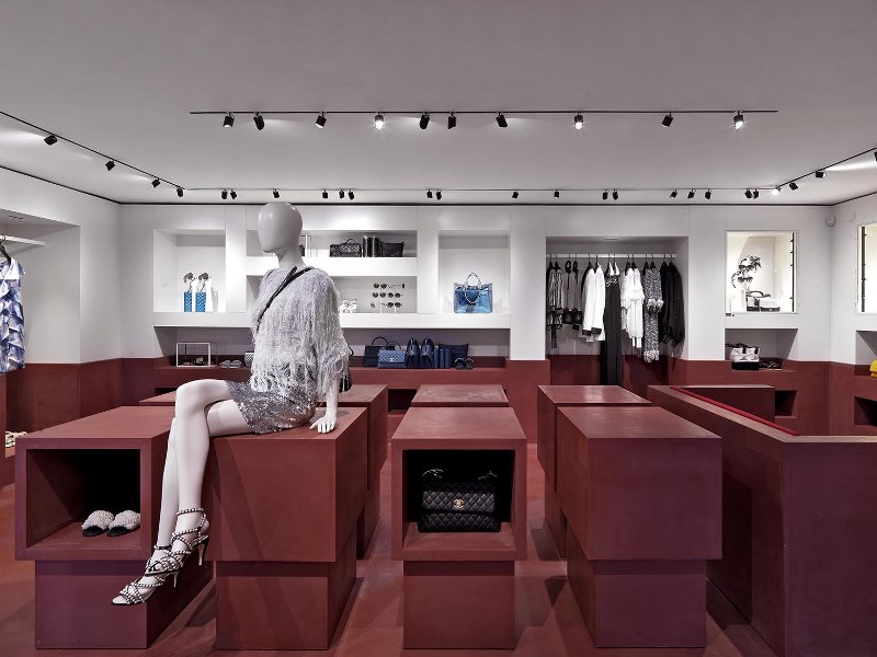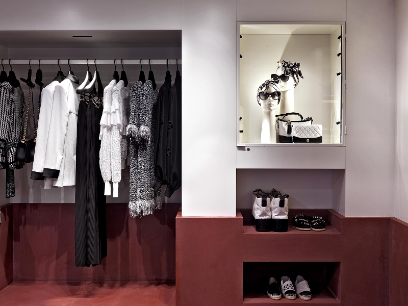 Una volta entrati nella Boutique, i codici della Maison si manifestano con discrezione. L’iconico, emblematico tessuto in tweed impreziosisce un divano e un camerino in un interno bicolore dove pareti, pavimenti e nicchie sono saturi di una vernice rosso lampone in sapiente contrasto con il bianco. Le sfumature di rosso all’interno della Boutique richiamano l’esterno, in un infinito gioco di rimandi. Il decoro costituisce la cornice ideale per presentare una selezione della collezione Métiers d’Art Paris Amburgo 2017/18, dal prêt-à-porter a borse, scarpe e accessori creati da Karl Lagerfeld. Le vetrine ospitano una selezione di gioielli d’eccezione dell’esclusiva collezione Camélia Ajouré e una di iconici orologiBOY.FRIEND e J12.