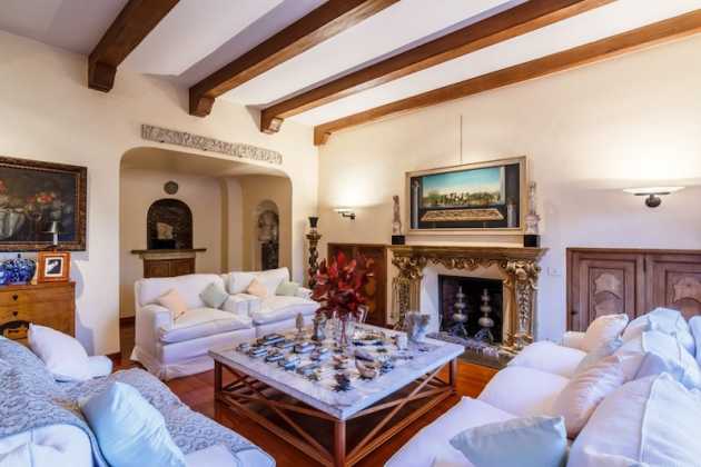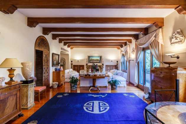 Un parco secolare, di circa un ettaro e mezzo, con alberi ad alto fusto e ampi spazi verdi circonda la proprietà. Nel parco si trovano anche una splendida piscina riscaldata, un’autorimessa e alcuni appartamenti di servizio indipendenti. Uno degli ingressi della villa padronale, al livello del giardino, introduce in una stanza con la volta in calcestruzzo e l’antica pavimentazione a mosaico di epoca romana. Sempre a questo livello si trova l’altra stanza con il pavimento a mosaico raffigurante Medusa e le pareti e la volta in tufo. Tramite la scala principale o l’ascensore si sale al piano superiore, destinato alla zona notte, con cinque camere da letto e relativi bagni e una biblioteca. A questo piano è stato realizzato anche un romantico giardino d’inverno.