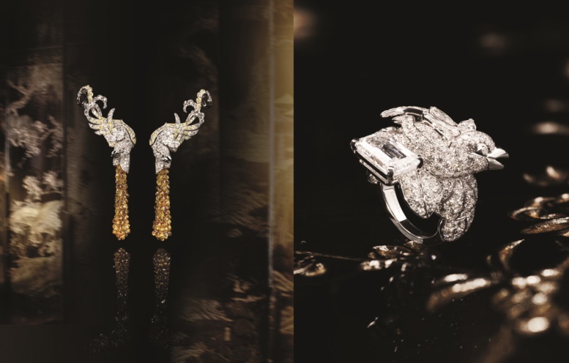 Al cuore del tema animale, gli uccelli sono sul punto di prendere il loro volo, come usciti direttamente dai paraventi, ornando un anello di diamante splendente di oltre dieci carati.