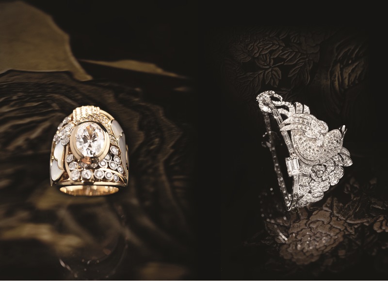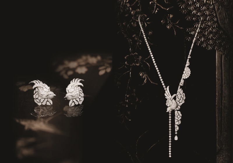 Il tema floreale ispira un polsino interamente reversibile, riprendendo la struttura geometrica dei paraventi, comprendendo un diamante giallo che ruota per restare sempre visibile al polso. Il tema minerale si staglia sulla pettorina della parure “Orizzonte Lontano” di oro giallo, punteggiato di nuvole di madreperla e di diamanti di cui il centrale di sei carati, rievocando un paesaggio di Coromandel.