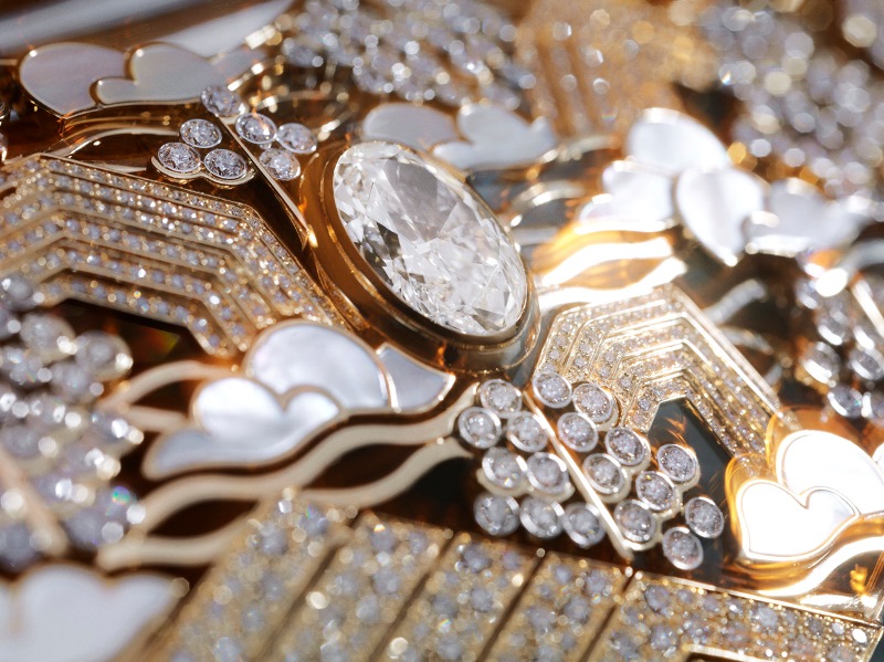 Il tema floreale ispira un polsino interamente reversibile, riprendendo la struttura geometrica dei paraventi, comprendendo un diamante giallo che ruota per restare sempre visibile al polso. Il tema minerale si staglia sulla pettorina della parure “Orizzonte Lontano” di oro giallo, punteggiato di nuvole di madreperla e di diamanti di cui il centrale di sei carati, rievocando un paesaggio di Coromandel.