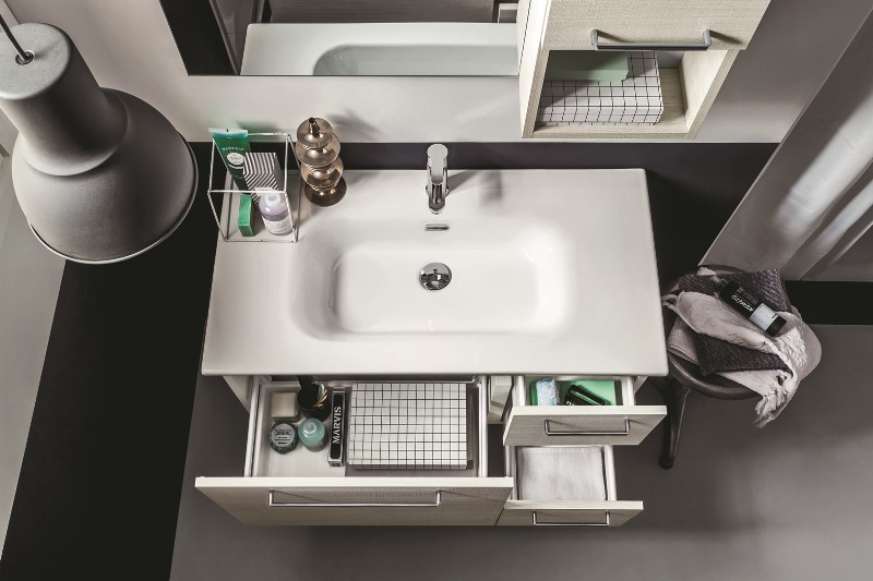 Ho.Me esprime la propria spiccata versatilità anche nella varietà di finiture proposte: differenti colori, legni e laccati definiscono mobili bagno unici e funzionali.