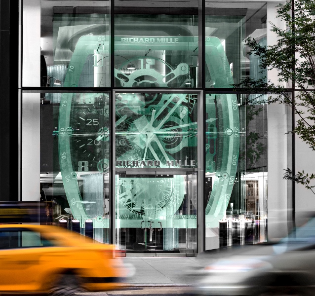 L’estrema tecnicità e maestria che contraddistingue gli orologi Richard Mille è evidente anche in ogni elemento della boutique, a partire dalla facciata in vetro alta 9 metri, visibile a un isolato di distanza. La parete trasparente a due piani è illuminata da circa 48 metri di luci a LED, per creare una presenza luminosa alla base della torre residenziale più alta dell’emisfero occidentale. Ventiquattro massicci pannelli di vetro – per un totale di 17 tonnellate – sono incisi singolarmente e disposti a tre profondità per formare una scultura eterea ispirata al movimento dell’RM 008 Tourbillon di Richard Mille.