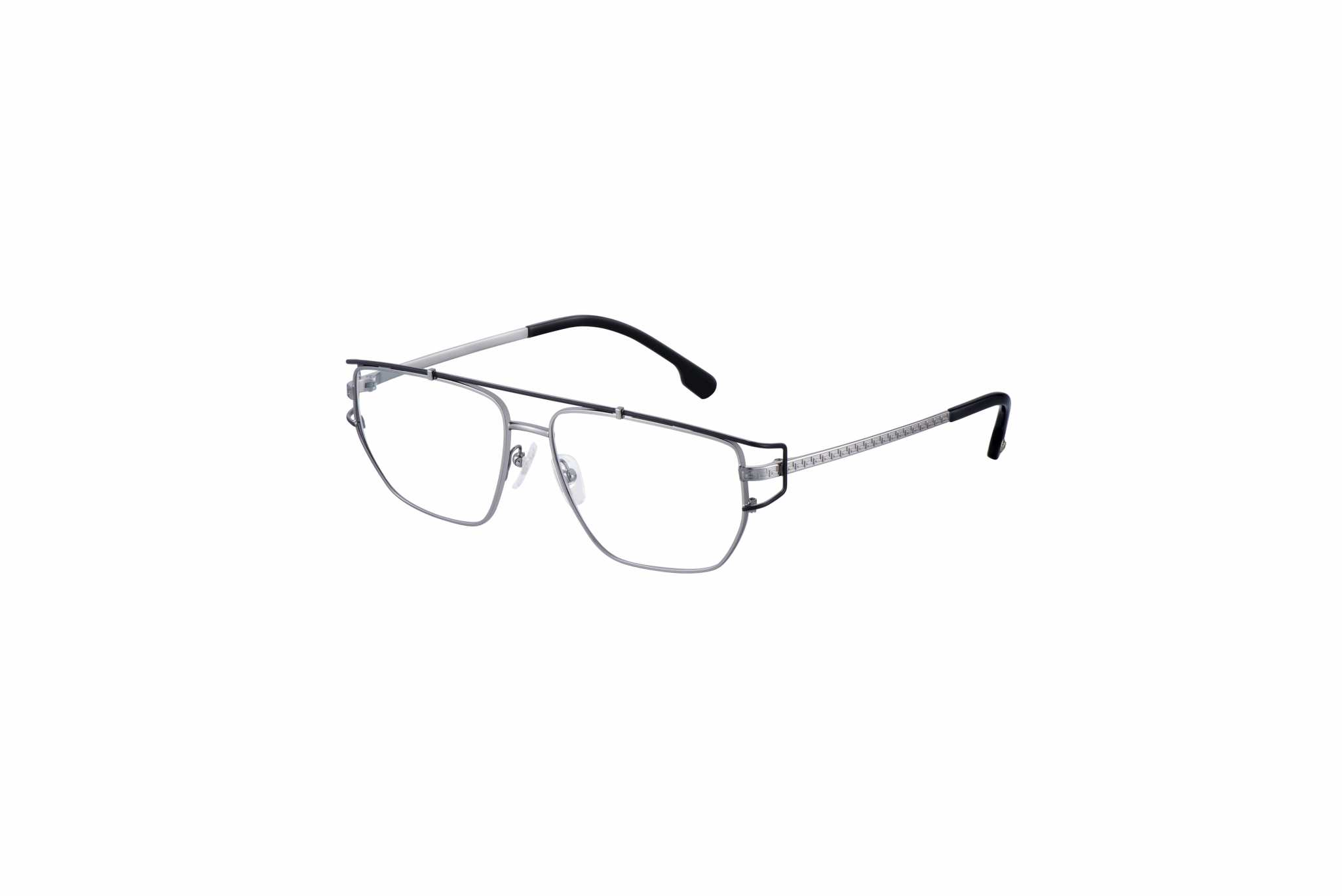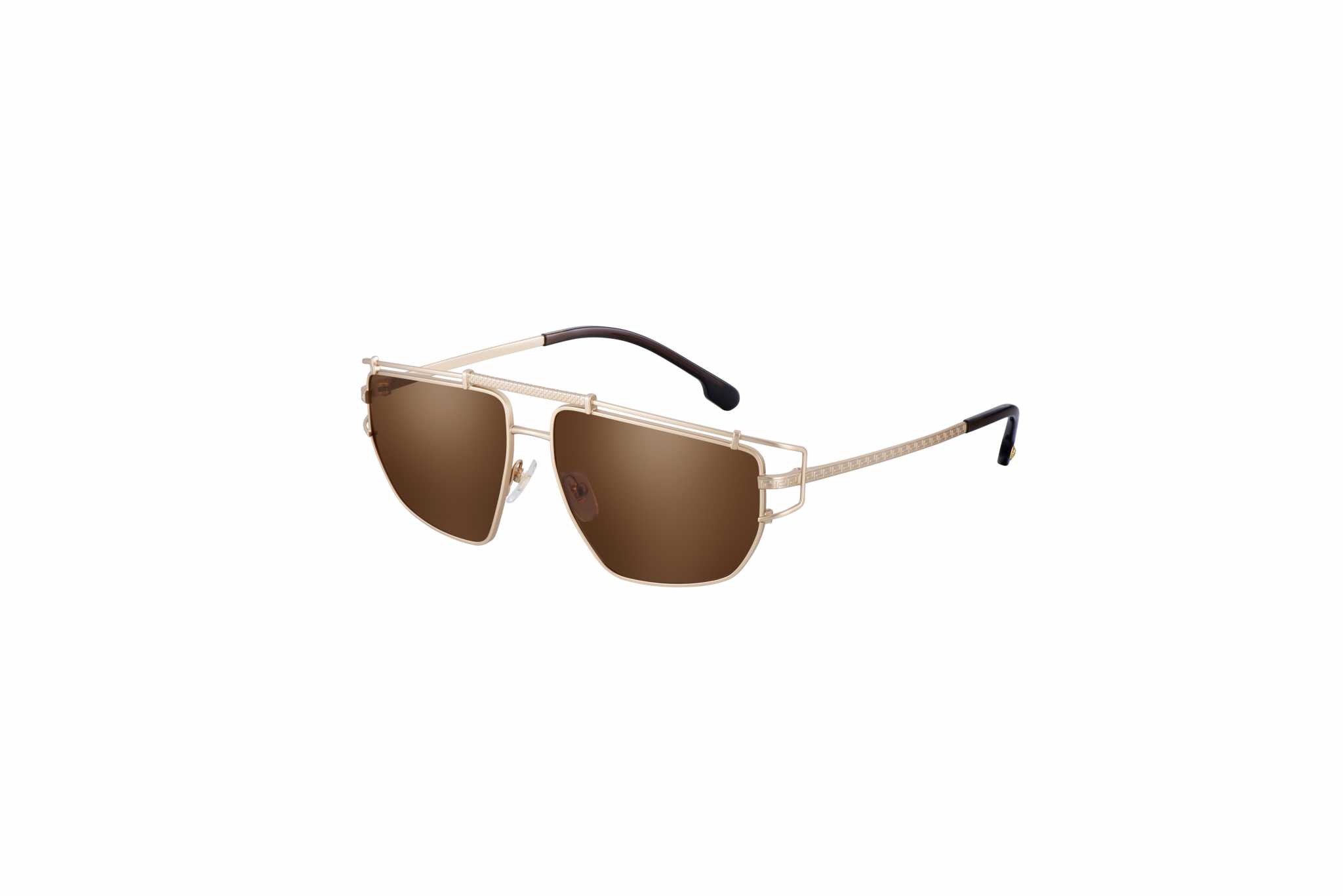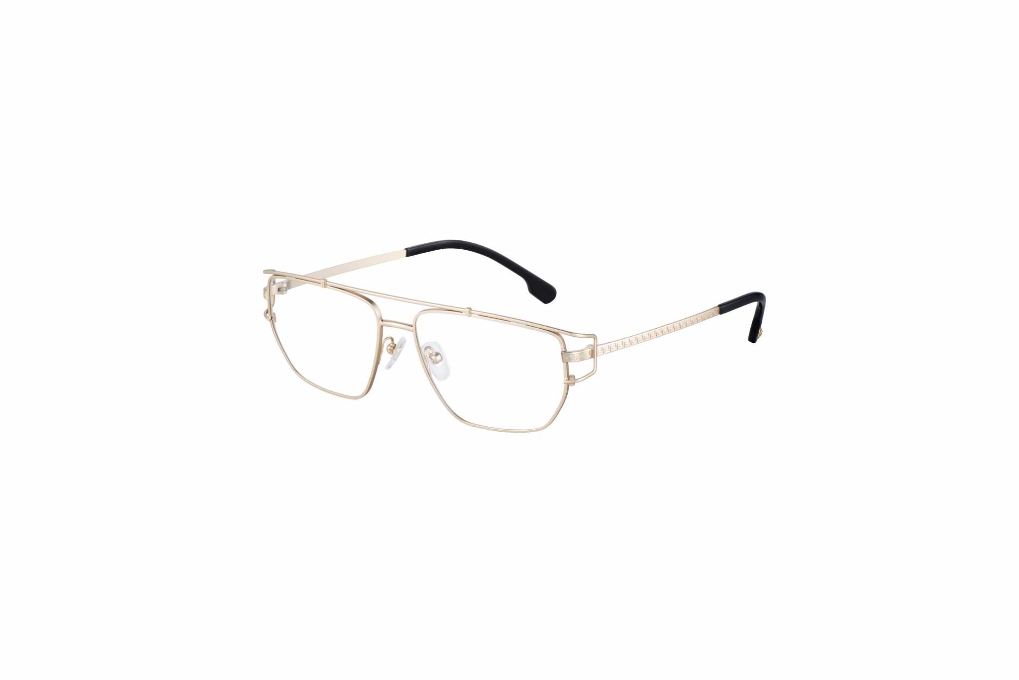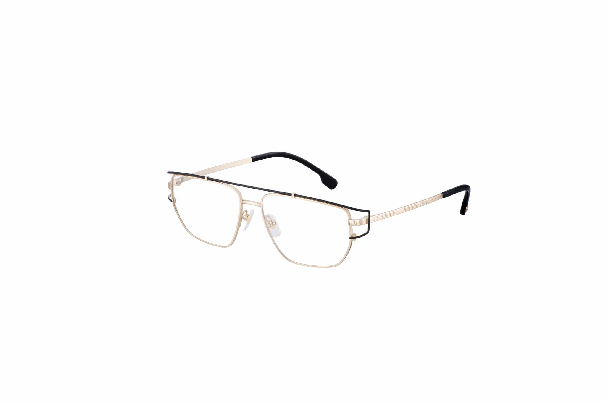 Il secondo modello ha i motivi Greca e i finali asta impreziositi dal medaglione Medusa, che definiscono il fascino di questo modello maschile: un occhiale con struttura metallica a cerchio aperto, caratterizzato da un doppio ponte con effetto “clip-on”, mentre le aste incise al laser con il motivo Greca sono ornate dal medaglione Medusa in corrispondenza dei terminali. Questo modello è disponibile in canna di fucile, oro opaco e oro.