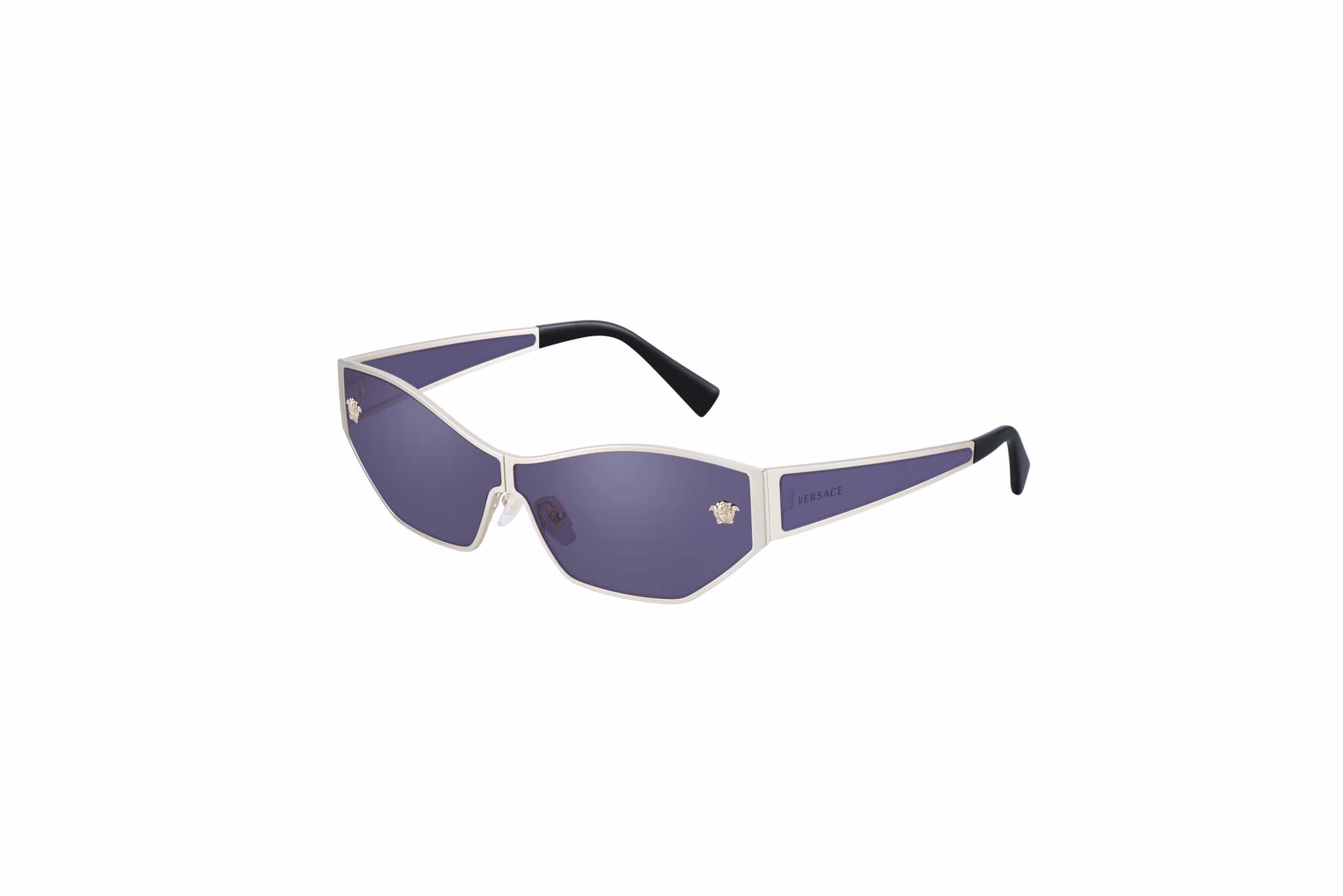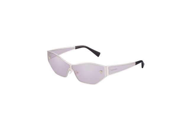 Il secondo modello Medusa Aspis, VE 2205, ha una montatura esaltata da bordi in metallo lucido e tonalità a specchio, che dona fascino e stile. Questa mascherina geometrica con lente bassa, ridefinisce il concetto di avanguardia, grazie a raffinati profili in metallo dorato e dettagli intricati: sul frontale spiccano le Meduse in 3D, mentre le aste sfoggiano il logo inciso al laser. La palette cromatica offre una variante in oro chiaro con lenti dorate a specchio rosa o viola.